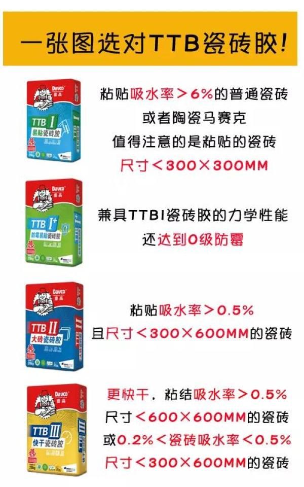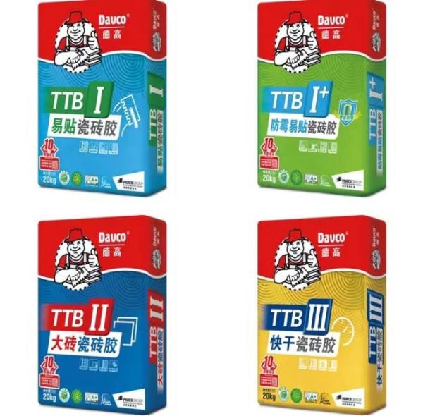 提到德高瓷砖胶,不少师傅和业主首先想到德高TTB系列的瓷砖胶——TTB I易贴瓷砖胶、TTBI+防霉易贴瓷砖胶、TTB II 大砖瓷砖胶和德高TTB III 快干瓷砖胶。