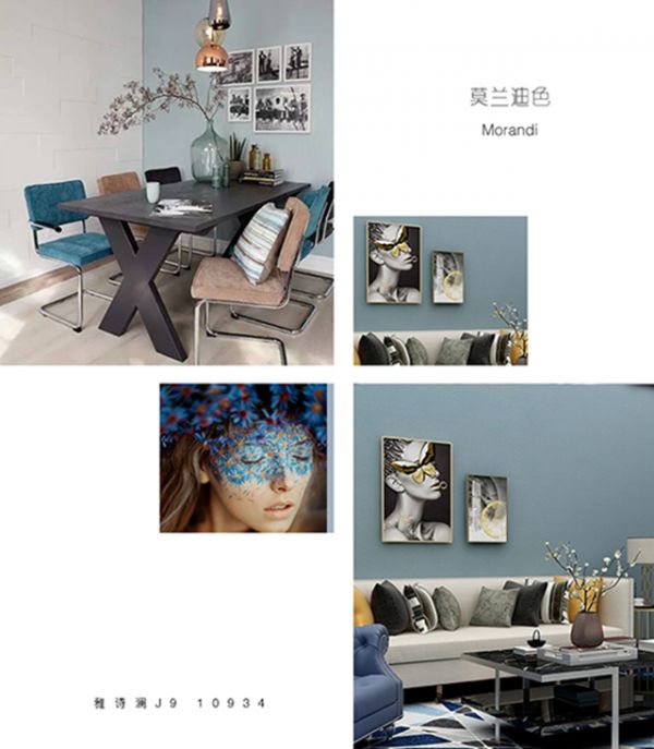 在颜色中加入一定比例的灰色,也就是所谓的高级灰。这一色系的颜色看上去不张扬,不鲜亮,却自带一种高级感,这也就是为什么大家都把灰色叫做高级灰的原因,莫兰迪色系仿佛蒙了一层灰调,每个颜色就像是花在石灰打的的墙上,渗入灰色和白色调,失去了各自原本强烈而浓重的颜色,柔和而优雅地与其它的颜色调和在一起,带给人平和自持、舒缓雅致,有时又略显冷静的感觉,总之是让人越看越喜欢。