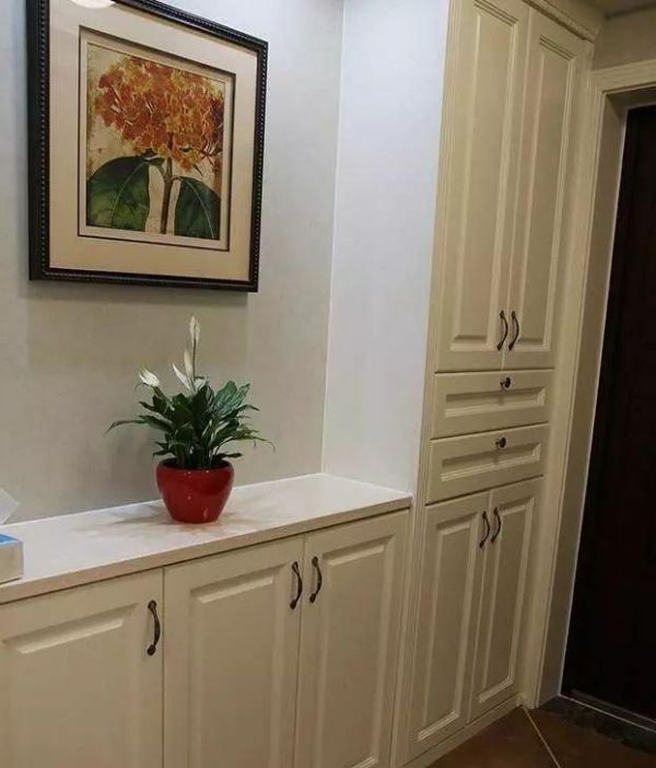 入户的玄关,右手边就是一个阶梯柜,这样设计的好处就是地柜的台面可以作为展示台,或者是可以收纳随手的物品,比如钥匙和手机等等,整个阶梯柜的收纳非常的强大,而且颜值还挺好的。地柜的上方墙面还用挂画做了装饰,美美的。