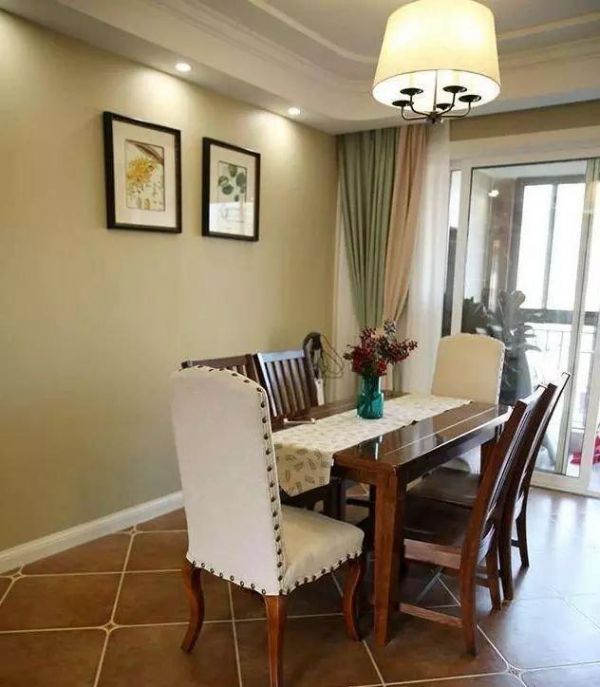 这个房子的采光挺好的,就连厨房也带有个小阳台,这个阳台主要就是晾衣服的。餐厅的装饰也是简单为主,不过色调搭配上却很有特色,比如深木色的美式餐后座椅,搭配墙面又是芥末绿的色调,暖灯的吊灯设计,整个温馨浪漫的餐厅情怀。