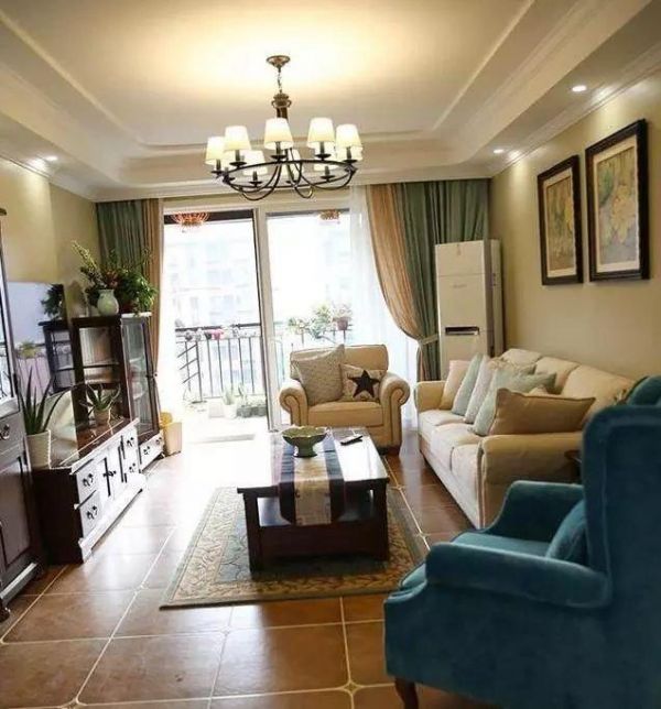 地面采用的是米黄色的仿古瓷砖,温馨大气,超好看。整个房子也是温馨暖暖的氛围。天花板没有过多的装饰,一盏经典美式的回字形吊顶,大气上档次,简单明亮。简单的家居设计搭配非常的好看了,而且电视墙还有玻璃柜作为装饰,可好看了。