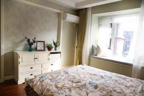 卧室,虽然没有电视,但是还是做了电视墙作为卧室的装饰,浅黄色的壁纸大气上档次,电视柜用一个经典白色调的美式斗柜,超好看的,收纳空间也很大。飘窗并没有做造型了,直接在上面铺上了瓷砖,然后在铺上坐垫作为休憩区。