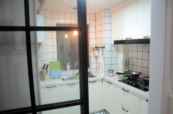 厨房内部是白色的格子砖设计,白色的L型橱柜设计简单实用美观,而且还有窗户,采光性能还是很可以的,格子砖可以说是北欧风格的主要元素之一,而且白色为主的色调更加的清新自然。