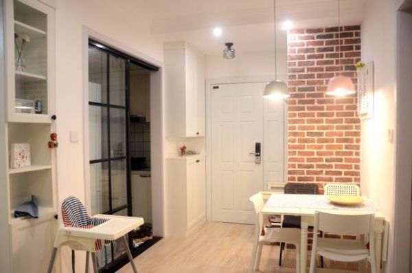 鞋柜过来就是厨房,作为独立的空间,不怕油烟的问题,而厨房正对着就是餐厅,餐厅虽然简单,但是整个氛围温馨舒适,而且还有后面的砖墙壁纸的设计,实用好看。