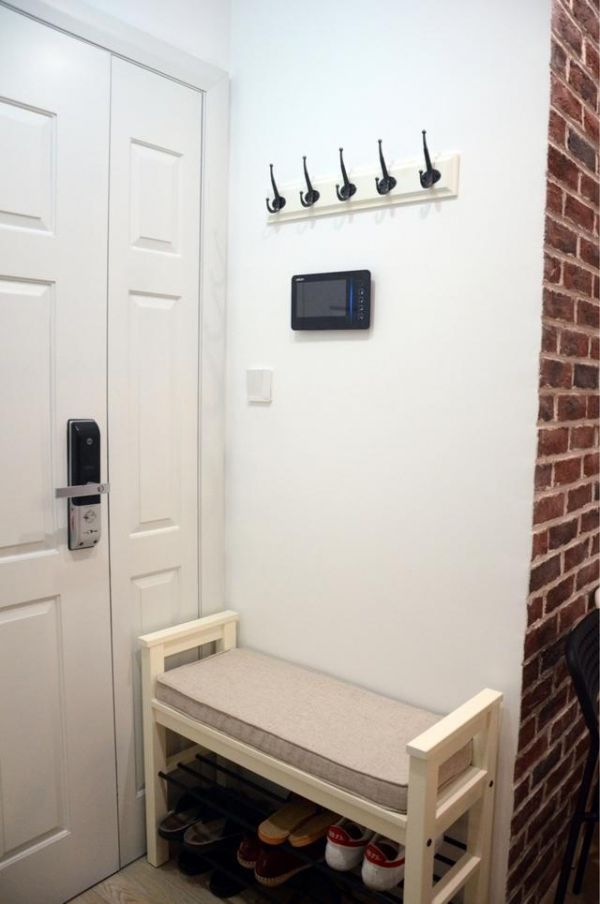 入户的左边就是一个成品鞋柜,简单实用,墙上在大了一排衣服挂钩,方便出入的随手物品,想要挂钥匙还是一副都是可以的哦。而右边还有还有个定制的鞋柜+收纳柜,宽度比较浅,由于屋子本身的面积比较小,选择了厨房门的一面墙做的定制柜,也是按照墙面的宽度定制的。