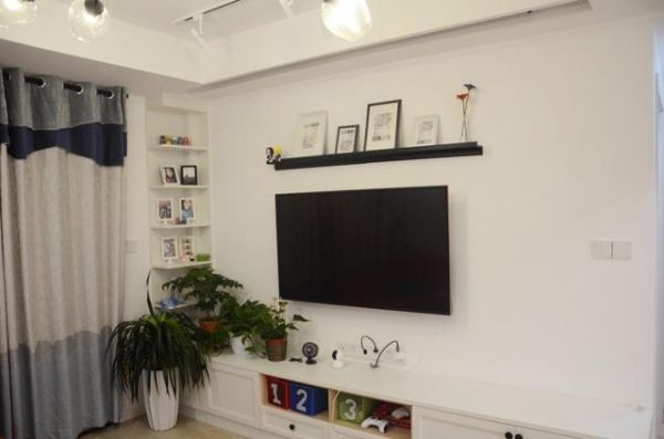 电视墙的装饰更为简单,电视还是直接挂在墙上的,还有电视的上方还装了一条黑色的置物板,显得格外的有格调。白色电视柜虽然不高,但是下方的收纳空间很大。
