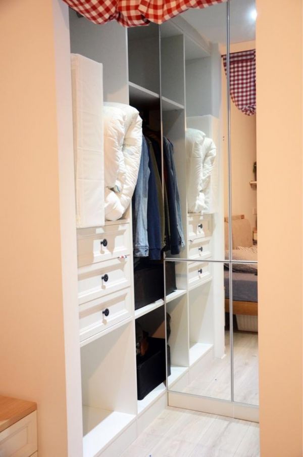 这就是前面提到的阳台改造成衣帽间,而且旁边留有一个小小的窗户照明,这样的衣帽间可以说是非常实用的了,还装了一面置顶的全身镜,衣帽间看起来大了一倍。