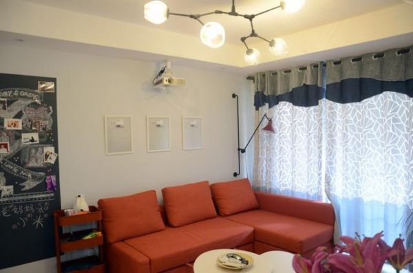 客厅,本来以白色为主的整个客厅粉刷,沙发的红非常的好看,一点都不会喧宾夺主,反而更加的和谐和温馨,沙发旁边还有个黑色的黑板作为装饰,简单很实用。