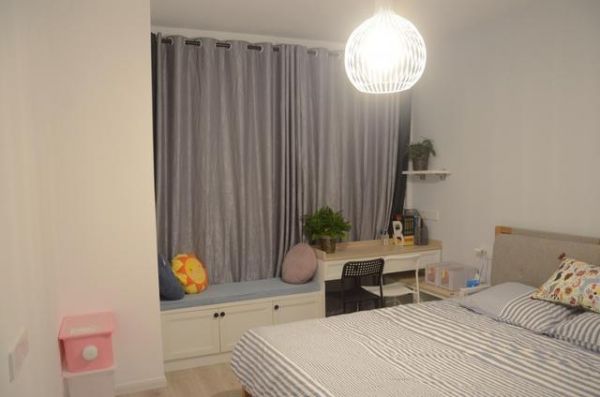 主卧室,温馨舒适的氛围正适合睡觉和休息。而且业主还充分地利用了飘窗的位置,一分为二,一半是收纳柜还可以当作休息区,一边植入一个小小的梳妆台(办公桌),非常的实用。