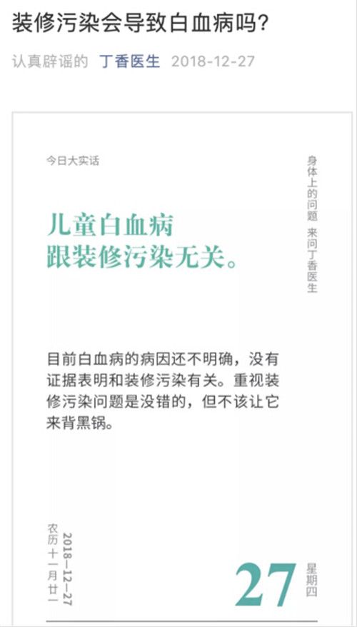 另外,丁香医生也指出,儿童白血病跟装修污染无关。目前白血病的病因还不明确,没有证据表明和装修污染有关。