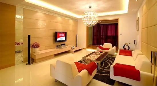 有些家庭会在电视墙一侧安装射灯,看电视时只打开电视墙一侧的灯具,这样会影响视听感受,也不利于眼睛健康。应在座位两侧都设计壁灯、台灯或落地灯,看电视时的亮度最好调至50%。