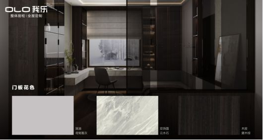 我乐现代轻奢风容悦系列全屋的门板由鸢尾雅灰、云水石和黛木棕三种花色组成。其中,由复杂繁琐的混油工艺制作而成的鸢尾雅灰门板,触感如婴儿肌肤一般细腻柔滑;云水石门板如其名字一般,拥有灵动雅致的自然元素,流动飘逸;实木贴皮的黛木棕门板则用其深色木质的色调纹路将整个空间点缀得更加低调沉稳。