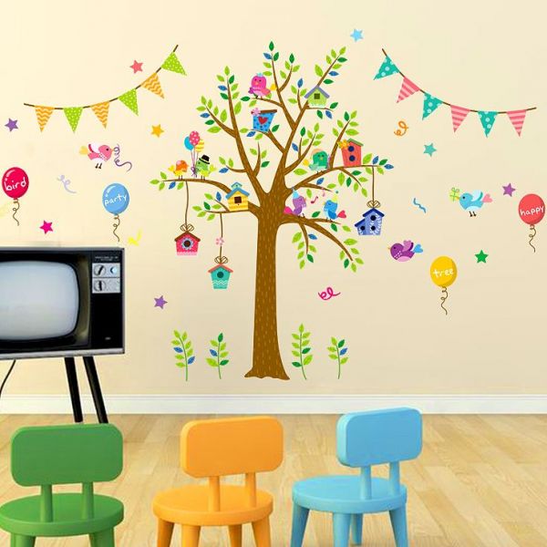 这款幼儿园墙面装饰以充满生机绿色为主,在一棵郁郁葱葱的大树上满是小鸟,他们有的在鸟巢里嗷嗷待哺,有的展翅翱翔,就像校园里的孩子们一样,可爱、活泼、充满生机。