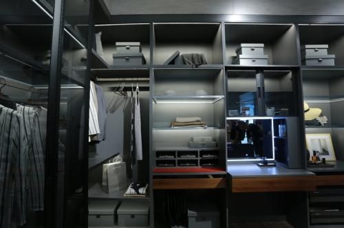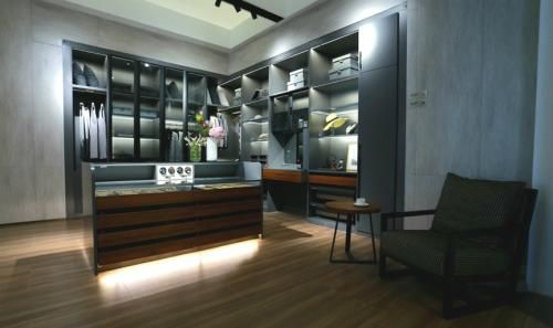 卧室空间,半开放式衣帽间,满足女性对精致生活的所有想象。设计师重视收纳与科技力赋能,通过有序收纳与“黑科技”让生活更便捷。产品运用了智能梳妆镜功能,健康指数、蓝牙、WIFI、视频音乐等科技功能一应俱全。无论有多少衣物,“米兰风尚”衣帽间都能通过不同收纳分区完美收纳,连低频使用的行李箱都规划在内;早晨,穿上熨烫整齐的衣裙,一边精心化妆,一边听音乐看视频,还可以通过妆台上实时显示的温度增减衣物,这简直是每个女孩的居家梦想!