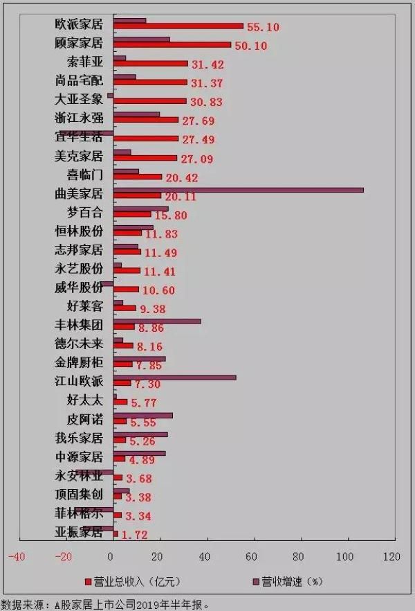 其中,欧派家居、顾家家居同期营业收入分别达55.10亿元、50.10亿元,分列1、2名。索菲亚、尚品宅配、大亚圣象营收均超过30亿元。