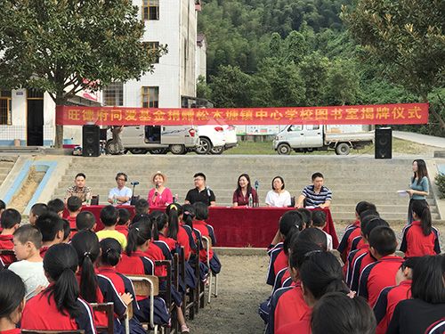 桃江县教育局领导刘卫纯表示非常感谢旺德府同爱基金一行人来到松木塘镇中心学校进行捐资助学活动,对学校教育环境的改善,给予很大的帮助。这次的捐赠对学校来说不仅仅是物质上的帮助,更重要的是为孩子们送来了宝贵的精神食粮。己的荣幸,活动进行到揭牌仪式,全体师生移步至图书馆参加揭牌仪式。