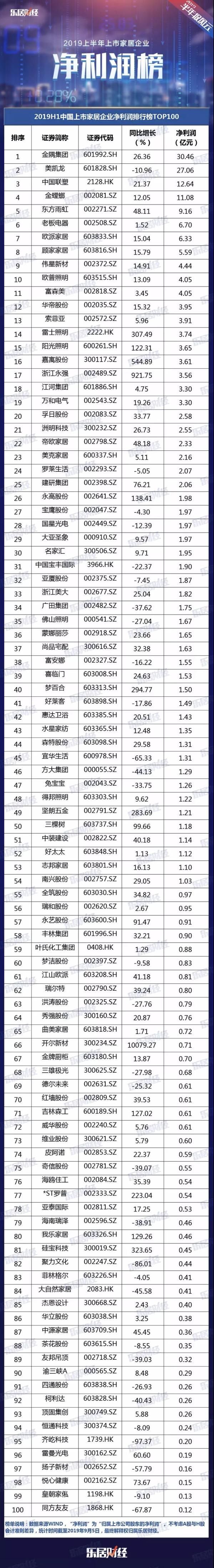 半年报收官之际,乐居财经挑选了100家主流上市家居企业,整理其2019上半年净利润(此文“净利润”为“归属上市公司股东的净利润”)数据,并发布了《2019H1中国上市家居企业净利润排行榜TOP100》。