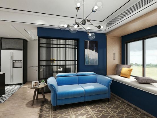 色彩面料上,采用了一款湛蓝色的绒面。湛蓝的色调搭配绒面的质感,给人一种别样的梦幻美,干净纯粹的线面,舍去繁琐线条与装饰元素,用简约线板及艺术作品体现细腻美感。挥洒在浓淡有致的墙面、定制家具与渲染意象的地毯上,体现宁静的美感。