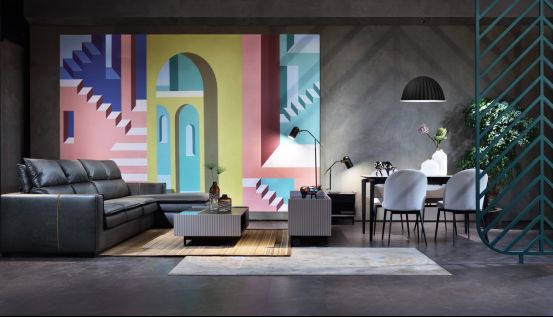 躺在沙发上随手拿起靠包,脑海里可能会浮现出毕加索的画作;石榴花元素充斥在产品的刺绣、床垫、装灯箱、吊顶灯、靠包小垫上,随处可见的设计与艺术相结合,让遥不可及的艺术悄然走进人们的生活。顺藤摸瓜,仿佛在家居生活中便可以窥见整个西方艺术史的脉络。艺术在家具之中流动,热情洋溢、自由奔放、色彩绚丽,诉说着属于年轻人的故事。