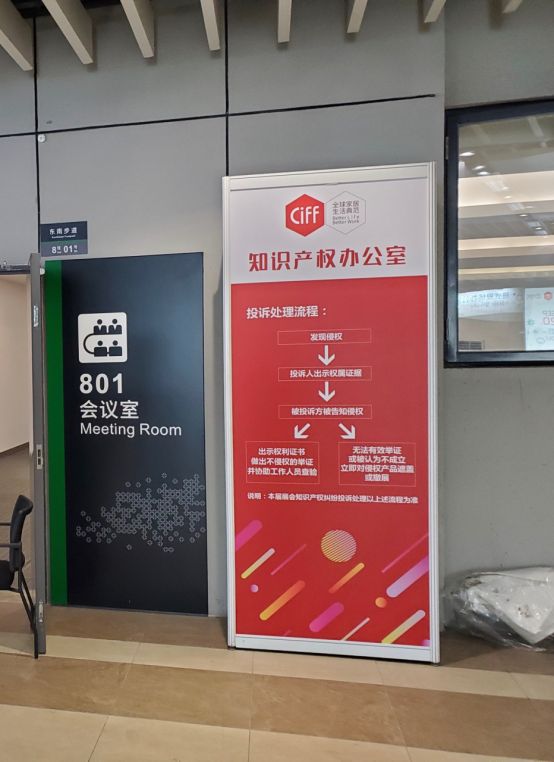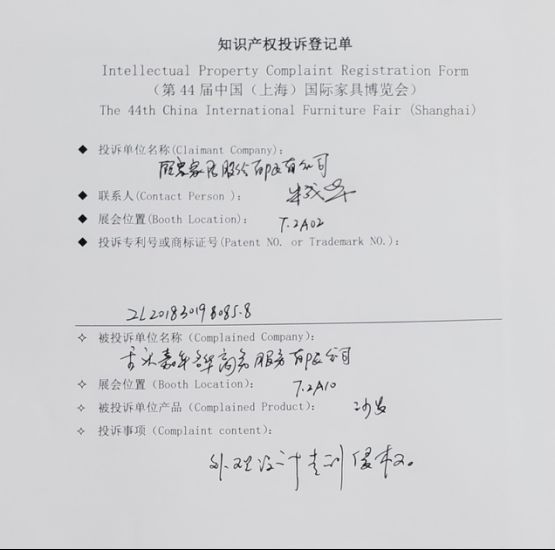 顾家工作人员向第44届中国(上海)国际家具博览会知识产权办公室提交《知识产权投诉登记单》及相关资料