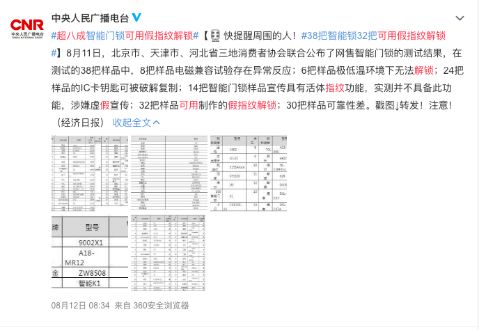 8月,关于智能指纹锁惨遭“破解”的话题引发热议。据了解,京津冀消费者协会联合公布了网售智能门锁测试结果,在测试的38把样品中,超六成智能门锁IC卡钥匙可被破解复制,超八成可用制作的假指纹解锁。