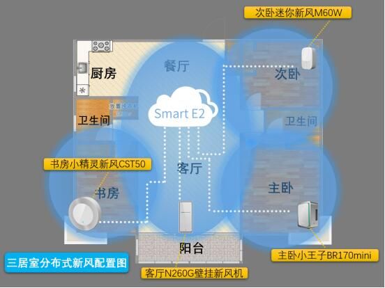 所谓分布式新风,是指根据房屋格局面积的不同、居住习惯的不同科学计算所需新风量以及机型配置,对新风设备进行科学分布布点,并且所有新风机可以由一个智能监测云系统进行控制,实现室内新风量的平衡,进而更好地提升室内空气健康度和舒适度。