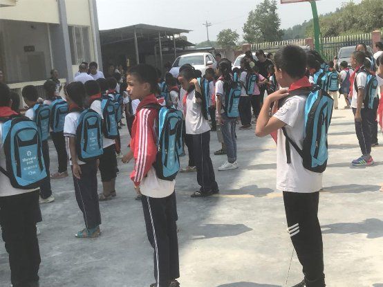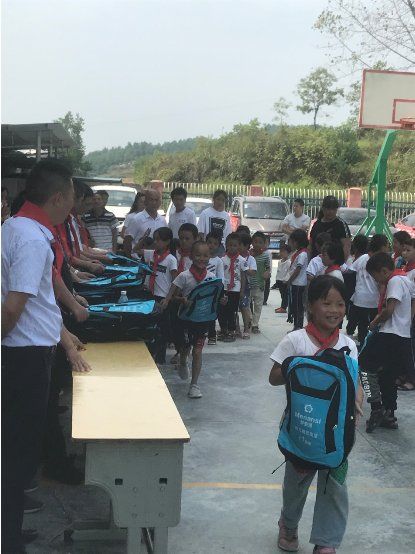 白滩小学的孩子们开心地拿到梦安思捐赠的新书包