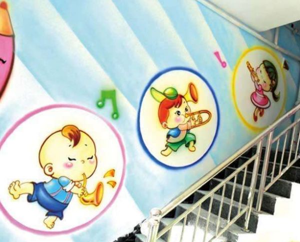 2、外墙1.2米以下可贴瓷片,一是为了方便清洁,二可增添幼儿园的特色和氛围,还可以挂一些幼儿写画的小黑板,这样可以让幼儿表现自我、墙面还可以画出大块的抽象图案。墙面的材料颜色要淡雅、明快,考虑到环境的功能性以及采光使用情况。这样能够体现出幼儿园特点。