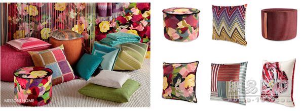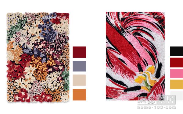 天香红作为2020年的关键色彩,自然少不了符合季节气氛的表现。著名意大利品牌MISSONI HOME有着充满想象且大胆的色彩运用,红色的应用更是丰富多彩,这得益于品牌精湛的工艺技术。红色在MISSONI家纺产品中有着多种色彩组合。Dancing Flowers系列中抽象为几何形态的花卉图案,凭借红色与草绿色的补色对比,粉色与淡黄色的衬托,加上天鹅绒材质与黑边流苏装饰,让整个系列充满勃勃生机。Stripes Mosaic系列以线性条纹和色块拼接图案为主,WINSLOW和KEW靠垫以红、黄、紫、豆绿等多色组合提花为特色,间隔无彩色分割,充满现代艺术感与异域风情。RAFAH 圆柱坐垫则运用纵向纹路结合暖桔色皮革材质,低彩度的红桔两色混合尽显简约与高雅。