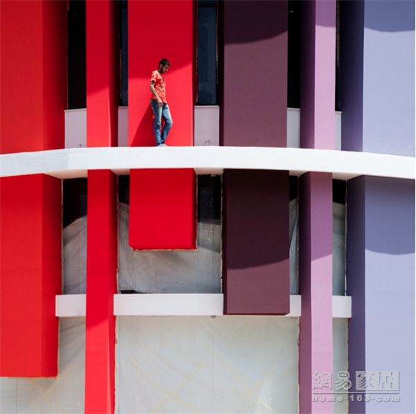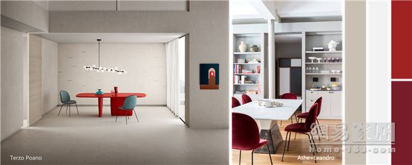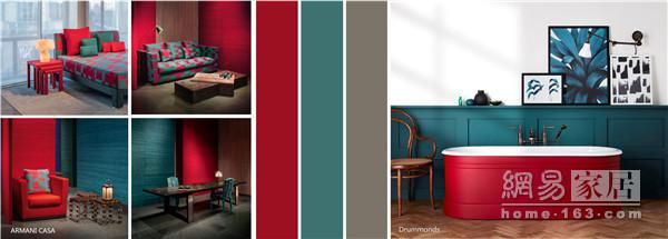 家居领域中,“积极的力量”被演绎得惟妙惟肖。著名高奢品牌ARMANI CASA,用浓艳的天香红碰撞时尚的蓝绿色,体块性的简约方正造型,配合简约几何图案,奢华时尚中突出个性的表达。大面积红色与蓝绿色的组合对比是强烈的,灰棕色石材地面与木质家具的加入,完美中和了两个对比色,避免了使用无彩色进行调和的无趣和强硬感。