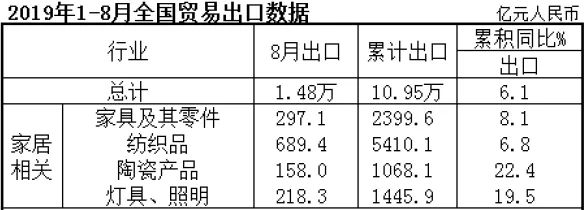 国家海关总署:前8个月家具出口同比增长8.1%