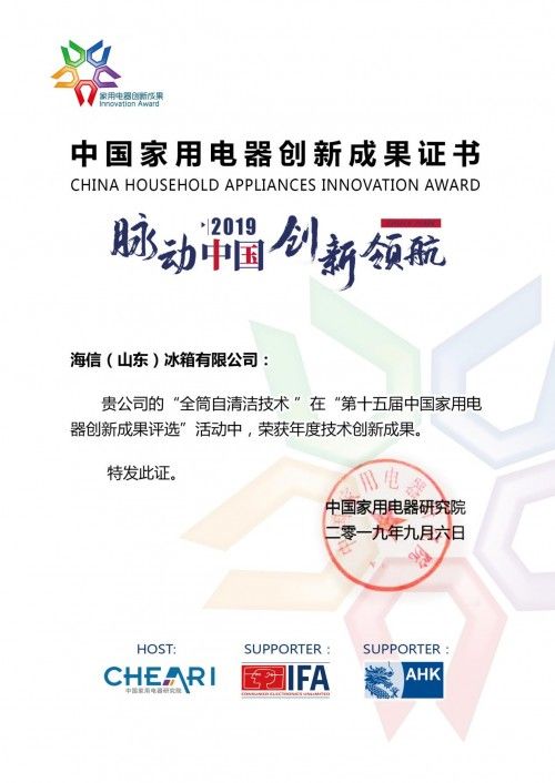 2019年9月6日,由中国家用电器研究院主办的“第十五届中国家用电器创新成果发布盛典”活动在柏林国际电子消费品展览会(简称IFA2019)举行。