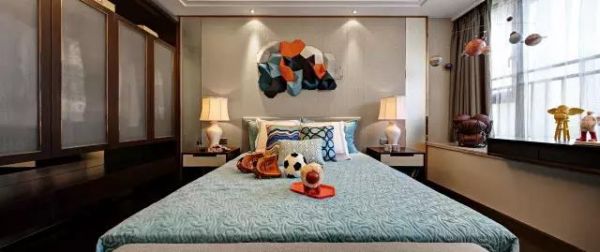 主人房主幅运用传统对称手法,采用淡绿色具有中式纹样的布艺作屏风,配以蓝色饰品点缀,整体空间深浅对比,渗透着淡淡东方情怀。