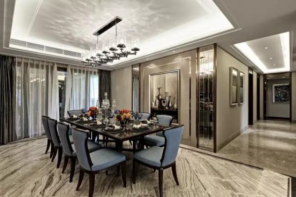 餐厅在别墅装修设计中采用灰木纹大理石地板,配以餐桌上墨青色的布艺,精美的中式挂坠,遥遥呼应着尊贵的东方气息。