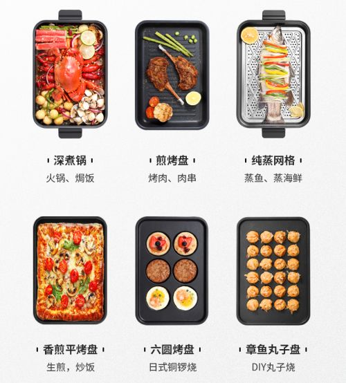 法格多功能料理锅有六款烤盘,任意选择,标配是主机+深煮锅+煎烤盘+蒸格,深煮锅是最常用的,平时吃火锅、炖汤、焗饭都比较方便;煎烤盘用途也很广泛,可以烤肉、煎牛排、炒意面等等;蒸格能用来蒸鱼蒸海鲜蒸馒头包子。