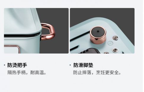 两边安装的是防烫手柄,不仅耐热而且方便搬运,用手去端也不会烫手;底部四角还有防滑脚垫,防止摔落,让烹饪变得更安全可靠。
