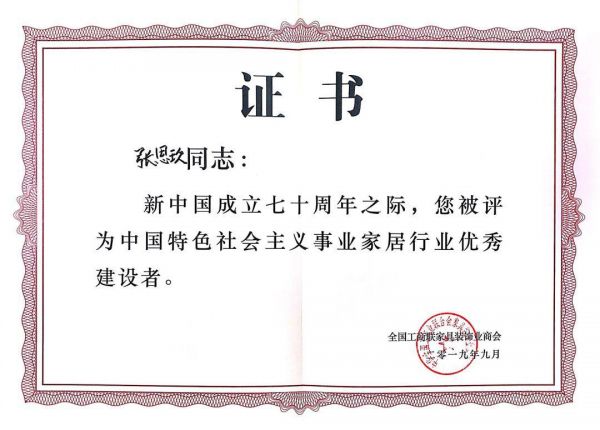 新中国成立70周年,中国家居行业也历经四十年蓬勃发展,并取得了重大成就,为国家社会经济的发展作出了重要的贡献,成为国家经济持续健康发展的重要力量。为进一步激励广大家居行业人士坚定信念,积极承担社会责任、坚持高质量的发展、继续弘扬制造业的工匠精神,献礼新中国成立70周年,举行了隆重的中国特色社会主义事业家居行业优秀建设者颁奖仪式。张恩玖先生荣获“中国特色社会主义事业家居行业优秀建设者”,这不仅是张恩玖先生个人的荣誉,也代表家居行业对久盛地板19年发展的极大肯定。