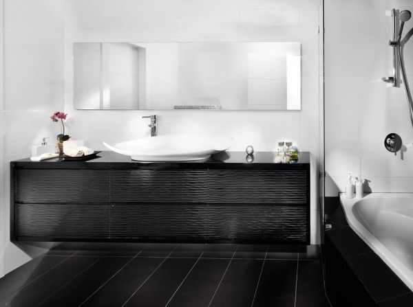 这款小户型卫生间为了呼应整体设计风格,不管是洗手台还是淋浴室,都采用黑白搭配,对于这样的设计,可以使整个空间更具时尚感。