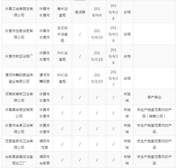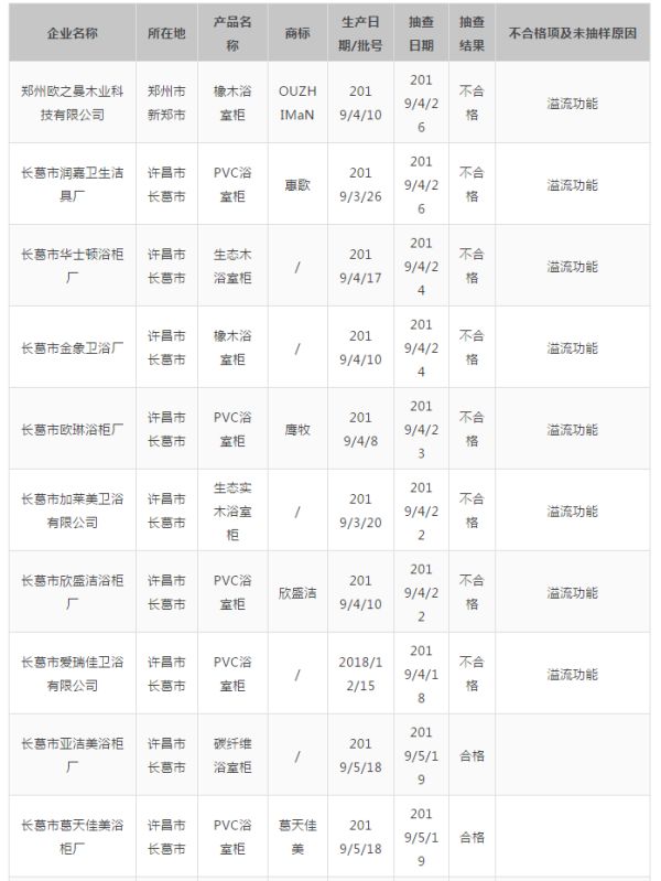 2019年3月份以来,河南省市场监督管理局在生产加工环节对水泥等19种产品组织开展了监督抽查。其中,8批次浴室柜产品不合格,标准规定在恒定的进水流量下,盆中的水不得溢出。承检机构为国家建筑装修材料质量监督检验中心。