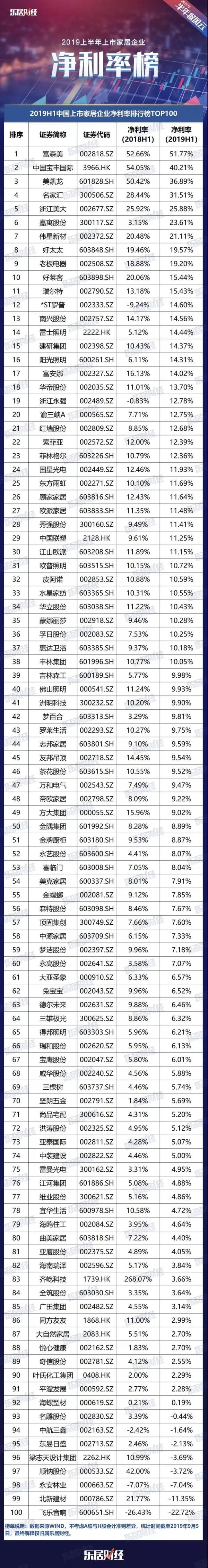 截至9月5日,除去敏华控股、航标控股等少数几家企业,中国上市家居企业2019半年度报告基本披露完毕。半年报收官之际,乐居财经挑选了100家主流上市家居企业,整理其2019上半年净利率数据,并发布了《2019H1中国上市家居企业净利率排行榜TOP100》。