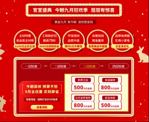 今朝九月狂欢季,层层有惊喜。全球精挑严选,确保装修材料环保、质量好;更有众多代金券,让你用最优惠的价格拿到最环保的材料,快来和今朝一起官宣吧!