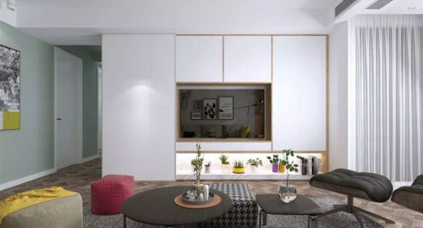 凹型电视背景墙结合木作电视柜,增加造型感同时也增强了空间的收纳。美观收纳两不误。