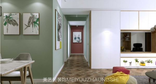 客餐厅一体化让整个空间看起来更加宽敞大气。绿色的墙面和白色的柜子遥相呼应,给人一种清新的感觉。
