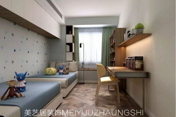 儿童房星星的壁纸让整个空间变得更加缤纷多彩充满童趣,多格储物柜增加了储物空间,给孩子留出更多玩耍,活动的空间。