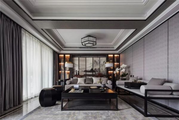 新中式客厅一般选用舒适、沉稳的色调,来营造一种安静和谐的气氛。在以黑、白、灰为主调的场景布置中,局部点缀一些鲜艳的色彩,不仅可以达到视觉平衡的作用,而且带来了一定的装饰效果。