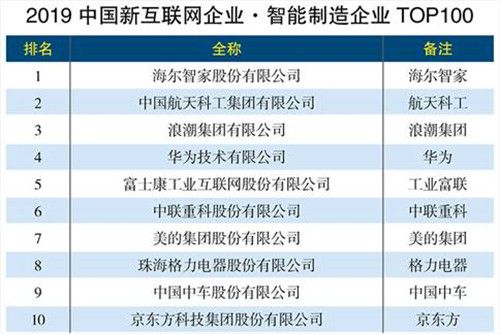 2019智能制造企业:海尔智家、航天科工、浪潮位列前三