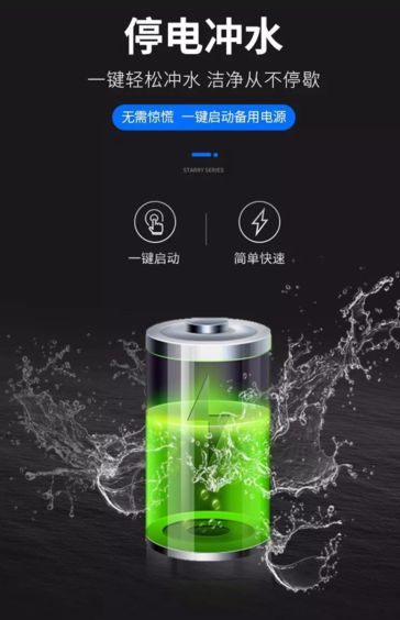 停电冲水也无忧:1键启动备用电源,简单快速冲水,洁净从不停歇。