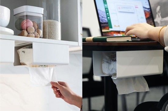 可以粘扣任何等地方的免打孔纸巾盒,一定程度地节省了空间。例如倒粘在橱柜的底部,为烹饪和洗菜洗碗提供便利的擦手功能;贴在书桌底部,随手抽取;还可以当成杂物收纳盒子,装进垃圾袋等小物品。