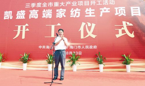 海门工业园区党工委副书记、管委会主任王帆先生为开工仪式致辞。作为展示海门形象的一个重要窗口,海门工业园区拥有独特的专业市场,并将充分依托特色家纺产业,注重质量、品牌、科技的创新工作,加快凯盛重大项目推进和国际物流园项目推进,提升凯盛市场综合实力。