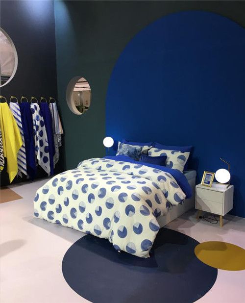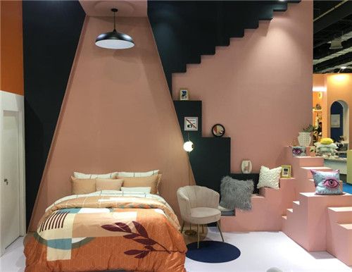 展品陈列突出色彩的相互碰撞与几何元素的搭配。重点展示了粉/蓝流行色系列床品自然麻系列、黑科技功能性面料、明远杯国际家居纺织品创意设计大赛获奖作品。